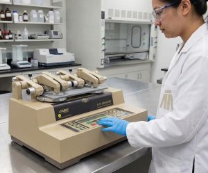 - آزمون مارتیندیل (Martindale): این دستگاه سایش را تحت بارهای مشخص (مانند 4N یا 6N) برای تعداد سیکلهای تعریفشده (مثلاً 160 سیکل) شبیهسازی میکند.